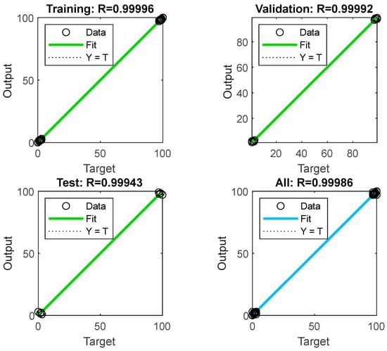 In this study, the Levenberg–Marquardt algorithm was employed, and the regression coefficient (R) was calculated as 0.99 for each tree model. The proximity of the R value to 1 indicates that the model’s output closely aligns with the actual values. The regression curves of the model are presented in Figure 11 for verification.