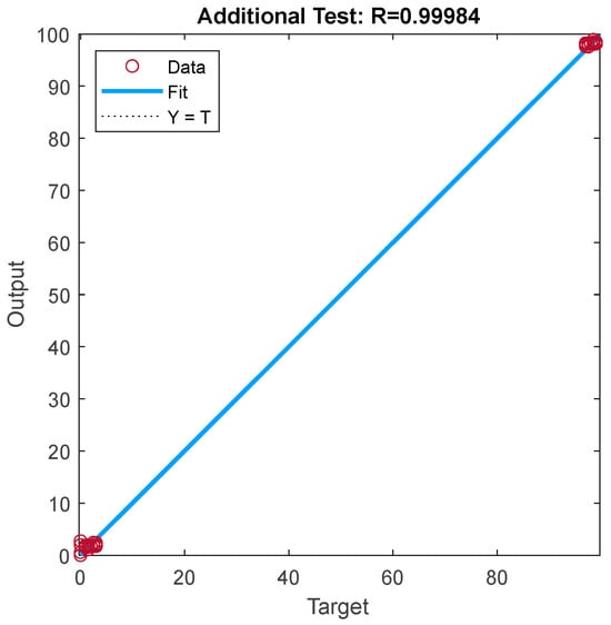 Finally, to ensure that the ANN model was not overfitted or underfitted during the training phase, the model was tested using data that were not used in the training process. The experimental data used for testing were not included in the training or validation phases, ensuring the independence of the test set. As a result of the test, the R and RMSE values were found to be 0.99 and 0.2, respectively. The regression curve corresponding to the NN model with the LL input is presented in Figure 12.
