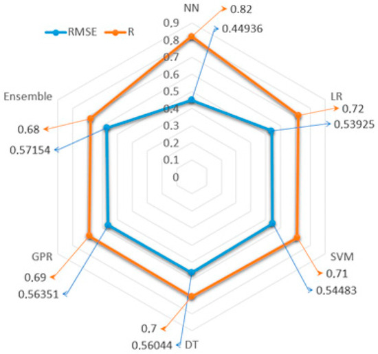 In contrast, other models, such as the LR, SVM, DT, GPR, and Ensemble methods, showed higher RMSE values, ranging from 0.53925 to 0.57154, and lower R values, ranging from 0.68 to 0.72. These findings highlight the better predictive accuracy and reliability of the NN model in this study.