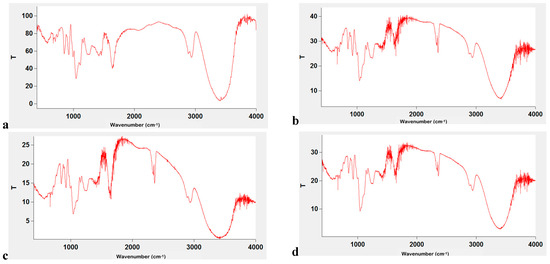 The FTIR spectra were measured using a BOMEM MB-100 (Hartmann & Braun, Brampton, ON, Canada) spectrometer coupled with a KBr detector, in the range of 400 to 4000 cm−1. It was used with 32 scans per spectrum with a resolution of 4 cm−1.
