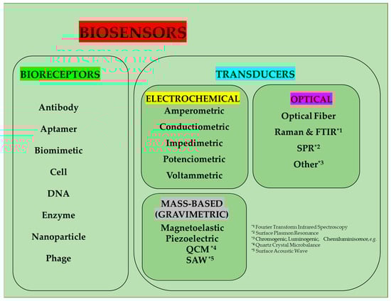 Biosensors can be categorized based on various criteria, with two common approaches being the type of transduction system employed, such as electrochemical, optical, piezoelectric, and thermal biosensors, and the type of biorecognition element (biocomponent or bioreceptor). The biocomponent or bioreceptor, such as isolated enzymes, whole cells, tissues, or aptamers, is essential in biosensors, enabling selective analyte detection and interaction. The energy released from this interaction is converted into a measurable electrical signal []. Common biological elements include enzymes and antibodies. Biosensors are further classified into biocatalytic sensors and affinity sensors based on their interaction with the analyte.