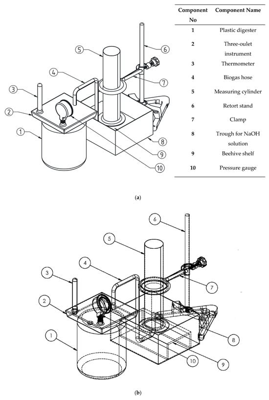 The food waste mixture, consisting of vegetable leftovers, rice, and cassava flour, was the main feedstock used for anaerobic digestion. The food waste was collected from various local restaurants around Lagos State University (Epe, Lagos, Nigeria), while the chicken dung used as inoculum was obtained from a local poultry farm. After collection, the food waste was blended and stored in a refrigerator at 4 °C until it was used. Before samples were taken from the food waste and inoculum for experimentation, they were thoroughly mixed to ensure homogeneity. The materials and equipment used in this experiment included a 2.5 L reactor, a 10 L capacity container for initial digestion, a furnace, pressure gauges, gas pipes, hose connectors, gas valves, a blender, measuring bottles, a pH meter, 1 L measuring cylinders, beakers, an oven, desiccators, a beehive shelf, a retort stand, a mixing container, a weighing balance, a trough for holding carbon dioxide (CO2) solution for gas absorption, Topgit gum, sodium hydroxide (NaOH), and hydrochloric acid (HCl) reagents (Figure 1).