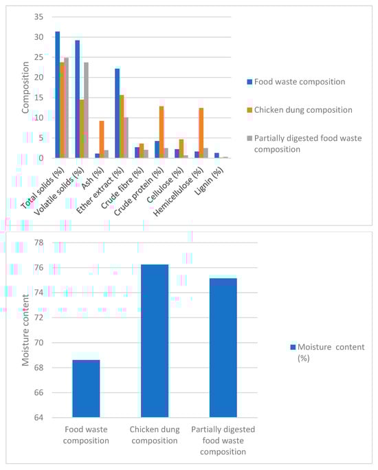 The effects of total solids content, inoculum source, and activated carbon supplementation on digestate quality in relation to plant nutrient compositions were evaluated through a semi-continuous anaerobic digestion process of food waste over a 60-day period at 25 °C in a 2.5 L plastic reactor vessel with an active volume of 1.5 L. The analysis used to determine the percentage concentration of moisture, ash, ether extract, crude fiber, crude protein, cellulose, hemicellulose, lignin, and total solids content of the inoculum and food waste is presented in Figure 2. The results showed that food waste comprised both organic and inorganic components. The organic component consisted of the digestible portion (volatile solids: 29.70% and ether extract or crude lipids: 22.18%), while the non-digestible portion included crude fiber (2.70%), cellulose (2.23%), hemicellulose (1.66%), and lignin (1.30%). The inorganic component included crude protein (total nitrogen: 4.25%) and ash (1.13%). The total solids content in the food waste was 31.38%, indicating a substantial amount of substrate available for conversion into valuable resources, such as digestate (biofertilizer). The digestate products included both digested and undigested feedstock components, as well as microbial biomass produced during the anaerobic digestion process.