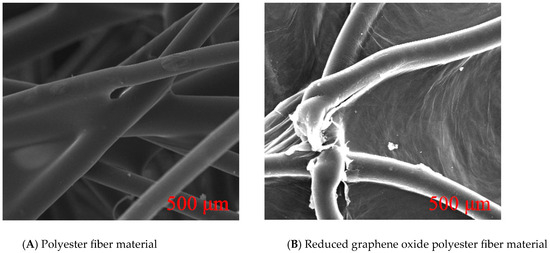 From Figure 1, it can be seen that the original polyester fiber air filter material, which is marked A, exhibits a natural tendency toward flatness and smoothness, and the fibers are naturally arranged. The surface of each fiber in the reduced graphene oxide polyester fiber material, which is marked B, becomes relatively rough, and its surface structure undergoes significant changes. A partial encapsulation layer appeared on the surface of the fibers, accompanied by some cross-linking and wrinkling, with a small portion exhibiting particle accumulation. This result is consistent with the literature findings and verifies the correctness of the results presented in this paper [33]. Furthermore, it is evident that the porosity of the fibers has decreased, resulting in higher filtration efficiency under the same conditions. Overall, it can be clearly seen that the internal structure of the synthesized composite material has changed, making its fiber structure more stable.