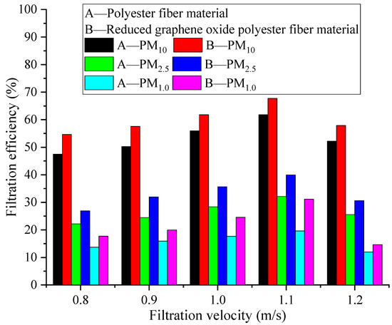 From Figure 2, it can be seen that as the filtration velocity increases, the filtration efficiency of both of the materials shows a trend of first increasing and then decreasing. At this point, the inertia effect and interception effect increase, while the diffusion effect decreases, increasing the capture efficiency of the particulate matter [35]. Small particles are mainly affected by Brownian diffusion, so the capture effect of small particles is lower than that of large particles. The reduced graphene oxide polyester fiber material, which is marked B, has increased the filtration efficiency of PM10, PM2.5, and PM1.0 by 5.6~7.3%, 4.7~7.8%, and 2.7~11.5%, respectively. This is because the composite filter material, which is marked B, has changed the internal structure of the original fibers, making them denser and reducing the porosity. Under the same conditions, when dusty airflow passes through, the denser fiber structure will increase the probability of particle capture, resulting in a significant improvement in filtration efficiency. However, at a filtration velocity of 1.1 m/s, the filtration efficiency of both filter materials reaches its maximum.