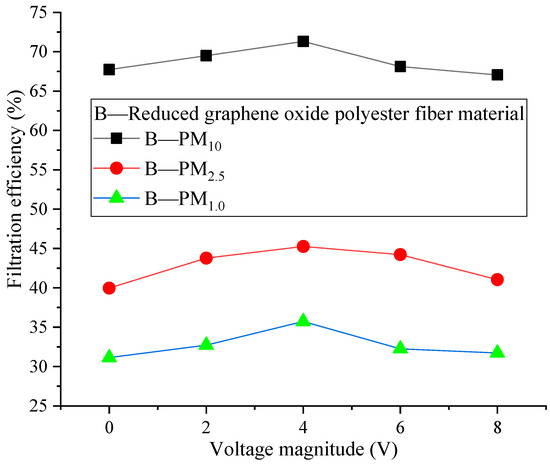 To further investigate the effect of voltage magnitude on the reduced graphene oxide polyester fiber material, which is marked B, the voltage magnitude was selected for experimentation at an optimal velocity of 1.1 m/s. The impact of different voltage magnitudes on the weight filtration efficiency of the new composite filter material is shown in Figure 3.