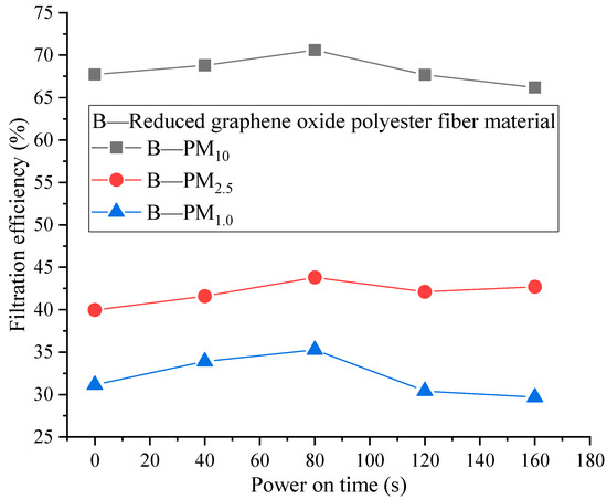 Under the same conditions and with a voltage of 4 V, the effect of different energization times on the filtration efficiency of the reduced graphene oxide polyester fiber material, which is marked B, is shown in Figure 4.