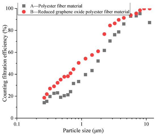 From Figure 5, it can be seen that the counting filtration efficiency of the reduced graphene oxide polyester fiber material is significantly higher than that of the polyester fiber material without external electrical conditions under the condition of a voltage of 4 V and an electrical duration of 80 s. This is because, in the absence of an external voltage, Brownian motion dominates, and small particles will bypass the fibers with the airflow without being captured by the fibers [35]. The new composite filter material treated with an external voltage generates a certain amount of charge, which captures small particles in the airflow through the fiber surface due to electrostatic effects, thereby improving its filtration efficiency. It can be clearly seen from the figure that there is a significant difference between the two materials in filtering particles from 0 to 2.5 μm. The new composite filter material has a more obvious effect, with a maximum difference of 17.3%. The difference in particles larger than 2.5 μm becomes smaller and smaller because the larger the particle size, the stronger its inertia effect, resulting in a higher probability of being captured by fibers.