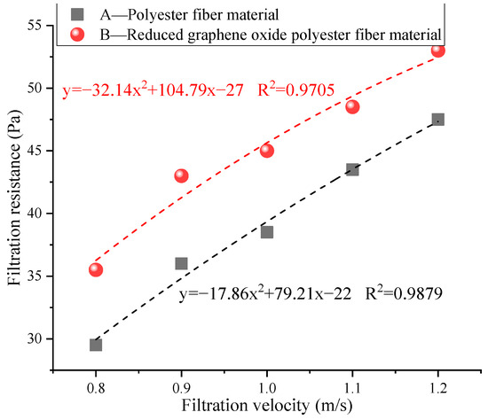 From Figure 6, it can be seen that the filtration resistance of both of the materials increases with the increase in the filtration velocity. Within the filtration velocity range, the resistance range of the polyester fiber material, which is marked A, is 29.5–47.5 Pa. The resistance range of the reduced graphene oxide polyester fiber material, which is marked B, is 35.5–53 Pa. It can be seen that the resistance of the reduced graphene oxide polyester fiber material is slightly higher than that of the polyester fiber material, with an overall increase of 5–7 Pa. The reduced graphene oxide polyester fiber material, after being treated with graphene, and the changes in internal gaps and intervals are confirmed by the fiber structure in Figure 1. Therefore, under the same conditions, the resistance of dusty gas passing through the fiber increases, affecting the uniformity of the airflow velocity field. This is consistent with the conclusions found in the literature [38]. This is related to the structure of the fibers, which also indicates that in practical use, the two evaluation indicators of resistance and filtration efficiency need to be selected according to the actual usage location. With the continuous rise of underground engineering, using new composite materials to ensure the stability and safety of underground special environments will be another research hotspot in the future, which requires continuous in-depth research on composite materials from multiple perspectives [39,40,41,42,43].