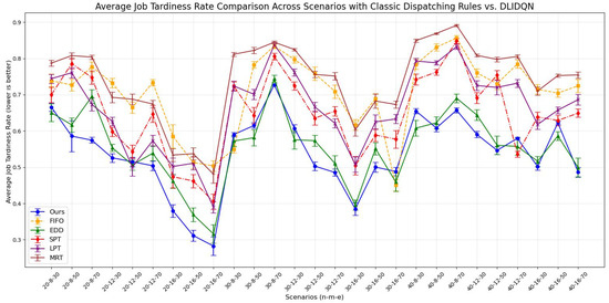 | Luo (2020) [33] | DQN | Dynamic multi-objective flexible job scheduling | Total tardiness | New job insertions |