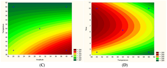 Contour surface representations for interaction of three tested extraction variables on the total phenolic content. (A) (Temperature × Time), (B) (Amplitude × Time), (C) (Temperature × Amplitude), and (D) (Time × Temperature).