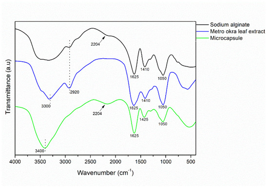 As shown in Figure 4, the FTIR spectra exhibited more intense absorption peaks in the range of 3700–3000 cm−1 and around 1600 cm−1. These peaks correspond to the aromatic O-H and C=C bonds attributed to phenolic compounds and sodium alginate [33]. Peak absorption in the region of 3300 cm−1 in the spectrum of the T. cucumerina extract and at 3400 cm−1 in the microcapsule were assigned to the OH elongation mode, indicating the presence of higher moisture and other molecules, such as alcohols, phenols, and hydroperoxides [34]. Changes in the position and intensity of the peaks were observed, which can be attributed to hydrogen bonds between polyphenols and sodium alginate. Low-intensity peaks were recorded in the region of 2920 cm−1 in the spectra of precursor materials, indicating –CH2 groups of alkyls [35]. Similarly, Luo et al. [36] demonstrated interactions between sodium alginate and guava leaf extract by the slight change during absorption at 2920 cm−1, attributing to C–H elongation. The attributions indicate that molecular interactions occurred between the precursors, as evidenced by the slight modification in the spectral profile of the microcapsule. Additionally, the characterization of the glycosidic bonds was demonstrated by the asymmetric elongation of the C=O and OH bands, which were observed in the range of 1035–1055 cm−1 across all evaluated spectra [37].