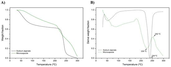 Thermograms defined in microcapsule form of T. cucumerina extract and sodium alginate. (A) Thermogravimetric analysis (TGA). (B) Differential thermal gravimetry (DTG).