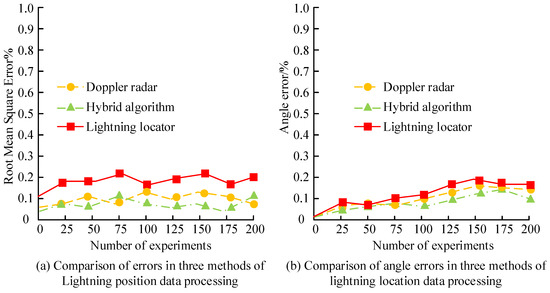 In Figure 6a, the root mean square error (RMSE) value of lightning warning signal positioning data processing for hybrid algorithm is 6.72%. The RMSE value of positioning data processing for Doppler radar and light locator is 9.84% and 13.69%, respectively. In Figure 6b, the angular error is one of the main influences on the positioning precision. The angular errors of hybrid algorithm, Doppler radar, and lightning locator positioning are 5.93%, 9.95%, and 11.82%, respectively. This shows the efficiency and precision of the hybrid algorithm in the processing of lightning warning signal positioning data. At the same time, the hybrid algorithm becomes the preferred method in lightning warning and positioning data processing due to its low error rate. The performance difference in the Doppler radar may be due to the extremely short and transient nature of lightning events, which may result in the inability of Doppler radar to capture complete information in time. The intensity of the electromagnetic radiation signal generated by lightning may be quite different from that received by the Doppler radar. Since lightning releases a lot of energy instantaneously, the detection principle of the Doppler radar is related to the specific frequency band or intensity of the echo signal, which in some cases may result in the inability to fully detect the lightning signal and affect performance.