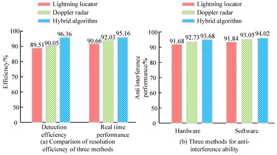Figure 7 shows the comparison results of the resolution and anti-interference ability of the three methods in lightning location data. The detection efficiency is calculated by comparing the total number of lightning events detected by the algorithm and the actual occurrence of lightning events. Real-time performance is evaluated by measuring the average time it takes the algorithm to process each lightning event. The anti-interference capability is evaluated by analyzing the ability of the algorithm to correctly identify lightning events in the presence of background noise or other signal interferences, and the false positive rate and false negative rate can be calculated using the confusion matrix. In Figure 7a, in the comparison of detection efficiency and real-time performance, the detection efficiency and real-time performance of hybrid algorithm are 96.36% and 95.16%, respectively. While the detection efficiency of the Doppler radar and the lightning locator positioning are 90.05% and 89.51%, and the real-time performance are 92.03% and 90.66%. In Figure 7b, the comparison results of the hybrid algorithm, Doppler radar, and lightning locator positioning in terms of hardware and software anti-interference ability are 93.68%, 92.73%, 91.68% and 94.02%, 93.05%, and 91.84%, respectively. This indicates that the hybrid algorithm is better than the Doppler radar and lightning locator in terms of detection efficiency, real-time, and anti-interference ability of lightning positioning data. Furthermore, it can provide more accurate and reliable data support for lightning warning and positioning.