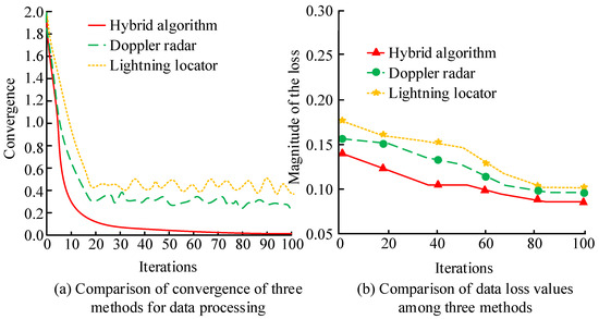 The comparison results of convergence and loss value of the three methods in data processing are shown in Figure 8. The evaluation of convergence is usually performed by observing the changing trend of the loss function during training. As the number of iterations increases, the loss value should continue to decrease, indicating that the model is gradually learning and improving. The loss value calculation is a measure of the difference between the predicted output of the model and the actual label. The study evaluates the time spent in lightning early warning positioning by the Doppler radar and lightning locator. The Doppler radar determines the speed of the target by transmitting electromagnetic waves and analyzing the frequency change in the reflected waves. The operating frequency of The Doppler radar is S-band, and the detection range is 500 km. The lightning locator locates lightning events by detecting electromagnetic radiation or sound waves during the lightning discharge. The frequency band is VLF band, and the detection range is 200 km. In Figure 8a, the convergence of the three methods in data processing decreases significantly as the number of iterations increases. The convergence value of the hybrid algorithm is finally in the range [0.01, 0.03]. The convergence value of the Doppler radar is finally in the range [0.25, 0.38]. The convergence value of the lightning locator is finally in the range [0.40, 0.53]. In Figure 8b, there are certain differences in the loss values of the three methods in the study of data processing loss values. The loss values of the hybrid algorithm, the Doppler radar, and the lightning locator during data processing are 0.09, 0.12, and 0.13, respectively. The change in loss values is 0.05, 0.04, and 0.04, respectively. This indicates that the hybrid algorithm has higher precision and efficiency in data processing and is the best performing choice among these three methods.