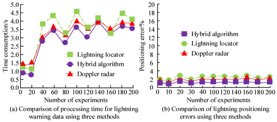 Figure 9 shows the comparison results of the time consuming and positioning errors of the three methods in lightning warning data processing. A total of 5000 samples are used for training. In Figure 9a, the average value of time-consuming lightning warning positioning of the hybrid algorithm is 2.39 s. The average values of time-consuming lightning warning positioning of the Doppler radar and lightning locator are 3.59 s and 4.12 s, respectively. In Figure 9b, in the lightning warning positioning error comparison, the positioning errors of the hybrid algorithm, the Doppler radar and lightning locator are 2.69%, 3.28%, and 3.95%, respectively. This shows that the hybrid algorithm has obvious advantages in lightning warning data processing. It is not only faster in processing speed but it is also more accurate in positioning precision.