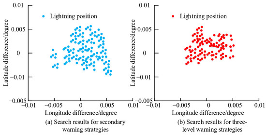 In Figure 10a, the data points in the plot are shown in blue color and are distributed at different coordinate positions. These points represent the relationship between the locations of different lightning events and the difference in longitude between them. The distribution of the points shows that most of the points are concentrated in the central region, but some points are scattered in more distant locations. This indicates that there is a certain range of precision for predicting or determining the lightning position under the secondary warning strategy. In Figure 10b, the data points are shown in red. From the distribution of the points, the overall distribution of the red points seems to be more concentrated than the blue points, especially in the center area. This indicates that under the three-level warning strategy, the prediction or determination of the lightning position has a higher precision. Moreover, it can more accurately reflect the relationship between the location of the actual lightning event and the difference in longitude.