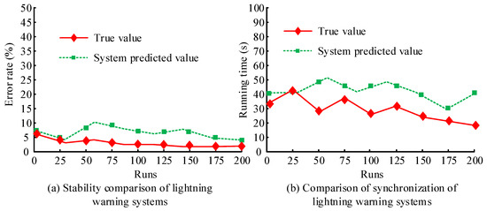 Figure 11 shows the result of the comparison between the predicted value and true value of the lightning warning system in terms of system stability and synchronization. In Figure 11a, the predicted error value of the lightning warning system positioning is 6.93% and the true value of lightning prediction is 5.01%, which is a 1.92% difference. This indicates that there is a certain gap between the lightning warning system constructed by the research using the hybrid algorithm and the true value. However, the gap is small, which also verifies that the lightning warning system has a high feasibility. In Figure 11b, in the comparison of synchronization, the overall running time of the lightning warning system positioning is 39.2 s, and the true prediction time of the lightning prediction is 35.9 s, which is a difference of 3.3 s. This shows that the lightning warning system has high feasibility and effectiveness. Although there are some gaps between it and the true value, these errors and gaps are relatively small and do not significantly affect the performance of the lightning warning system. To further verify the performance of the lightning warning positioning system, the study compares the positioning success rate predicted value with the true value. Table 1 shows the results of the comparison between the predicted value and the true value of the positioning success rate.