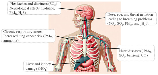 With regard to human health, there are short-term and long-term effects of exposure to pollutants in the air. Short-term exposure often leads to irritation of the eyes, nose, and throat along with symptoms like headache, dizziness, and allergic reactions [2]. These effects are usually temporary and may disappear once exposure ceases. However, long-term exposure is severe, potentially causing chronic respiratory issues, harm to vital organs like the liver and kidneys, and an elevated risk of cancer, as depicted in Figure 1 [2].