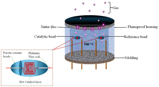 A catalytic gas sensor is also known as a pellistor. The sensor, designed with safety in mind, consists of two beads: a catalytic bead and a reference bead. Both beads contain a platinum wire coil embedded in a ceramic material, as illustrated in Figure 2. The catalytic bead is sensitive to flammable gases, while the reference bead (inert and non-reactive) provides a constant baseline signal without reacting to gases, ensuring accurate detection of flammable gases for safety [7]. When combustible gases (such as methane, propane, and hydrogen) react with oxygen, they produce heat in an exothermic reaction on the catalyst’s surface within the detector, known as catalytic combustion. This process allows ignition at lower temperatures, which is crucial for detecting potentially hazardous and explosive gases [7]. The sensor uses a Wheatstone Bridge-type circuit to convert the change in electrical resistance caused by temperature increases within the detector coil due to gas oxidation into an electrical signal. This signal directly reflects the gas concentration being measured. The operating principle of a catalytic combustion-based gas sensor involves a temperature change resulting from the exothermic reaction of the detected gas on the catalyst surface. It offers robust and easy operation, simple installation, low replacement cost, and suitability for challenging environments like dusty, dirty, and high-temperature settings [7]. However, limitations such as catalyst contamination, oxygen requirement for detection, and considerations for prolonged use should be noted. Also, the ideal temperature range for detecting hydrocarbons is 900–1000 °C, but platinum evaporates, and its resistance increases at these temperatures [7]. To address this, Kalinin et al. developed a high-performance microheater-based catalytic hydrogen sensor on a porous substrate made of anodic aluminum oxide (AAO) coated with a platinum (Pt) layer (Pt/AAO) [8]. The sensors achieved a hydrogen sensitivity of 76 mV/vol%, with a fast response time of 0.4 s and long-term stability, showing less than 4% deviation over 14 days of continuous operation. Operating at an active zone temperature of 500 °C, the sensors maintained low power consumption of 3.2 mW in pulsed power supply mode [8]. The detection limit was estimated to be 12 ppm. The study utilized a pulsed power supply mode to reduce the operating temperature, enhancing the sensors’ efficiency [8].