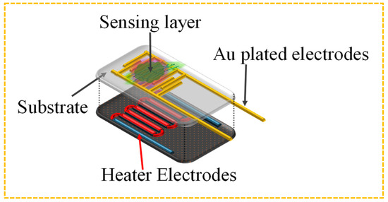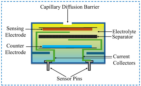 Semiconductor gas sensors operate by detecting changes in a semiconductor material’s resistance when exposed to target analyte gases. Typically, these sensors comprise a sensing element made from metal oxides (e.g., tin dioxide (SnO2)) integrated onto a substrate with electrodes and a heater, as shown in Figure 7. The metal oxide layer is porous, to increase the surface area for gas interaction, and when gases adsorb onto the metal oxide surface, the sensor’s electrical conductivity changes, altering its resistance. The important components of these sensors include the sensing layer, heater coil, electrodes, tubular ceramic substrate, and protective case [18]. The heater plays a crucial role by increasing the temperature of the sensing element. By maintaining temperatures above 200 °C, the heater accelerates the reversible gas adsorption process rate. This elevated temperature enhances gas interaction with the oxide surface, leading to more rapid changes in electrical resistance [18]. Semiconductor sensors have advantages, such as a simple and cost-effective design, high sensitivity to a range of gases, and broad applicability in safety and security systems. However, they also have limitations, including a limited linear measurement range and susceptibility to interference from other gases and ambient temperature fluctuations [18].