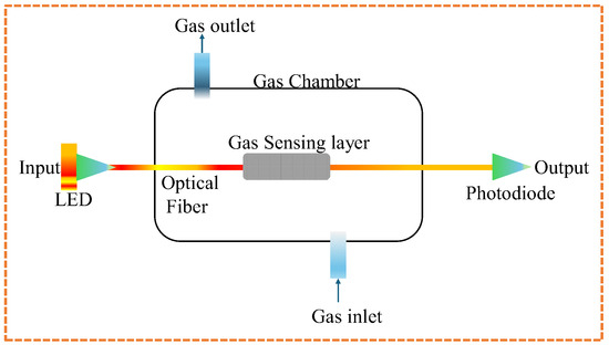 Fiberoptic VOC gas sensors have emerged as an innovative technology for detecting VOCs. Originating in the late 1980s, compared with traditional methods, these sensors offer distinct advantages such as high sensitivity, selectivity, and the ability to operate remotely using optical fibers [14]. A typical fiberoptic gas-sensing system comprises essential components such as a gas chamber that contains the target gas for analysis, a light detector, a light source (laser or broadband), the fiberoptic gas-sensing probe, input and output fibers for transmitting light to and from the sensing probe, and a demodulator to process the modulated optical signals received from the probe (see Figure 5) [14]. The operating principle involves directing light from the source to the modulation area inside the fiberoptic sensing probe. When the gas chamber receives the target gas, it interacts with the light within the modulation zone, modulating the optical properties. These modulated signals travel through the optical fiber and reach the optical detector and demodulator, where the measured parameters are obtained [14]. Optical fiber gas sensors offer several advantages, including immunity to electromagnetic interference, remote sensing capabilities over long distances, multiplexing for cost-effective solutions, and a compact and lightweight design that easily integrates into existing systems [14]. However, these sensors also have drawbacks such as the relatively high initial setup costs, unfamiliarity among end users compared with traditional sensors, and their sensitivity to physical damage, necessitating careful handling and protection [14]. Liu et al. conducted a detailed study to develop a new fiberoptic sensor for detecting ethanol gas using a special coating made from ZnSnO3 nanoparticles and TiO2 [15]. The sensor operated by utilizing ultraviolet (UV) light, which significantly boosted its sensitivity. It demonstrated a high sensitivity of 3.85 pm/ppm for ethanol concentrations ranging from 0 to 250 ppm, which was approximately 6.6 times more sensitive than similar sensors that did not use UV light [15]. The sensor also proved to be stable, had a rapid response time of about 20 s, and was highly selective toward ethanol gas. This research underscored the importance of UV light in enhancing gas sensor performance and marked the first use of ZnSnO3/TiO2 composite materials in fiberoptic sensors [15].