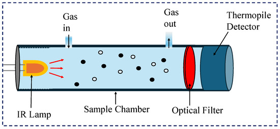 The operating principle of the NDIR gas detection method utilizes gas molecular absorption spectroscopy, in which gases absorb specific infrared radiation, resulting in thermal effect changes that are converted into electrical signals for detecting gas concentration [16]. NDIR sensors can detect many different gases at the same time because of the unique way each gas absorbs infrared light. These sensors have an infrared light source, a space to hold the gas (gas chamber), and a detector (Figure 6) [16]. In the infrared (IR) band, gases exhibit a unique fingerprint characteristic. Each gas absorbs specific wavelengths when exposed to infrared radiation, resulting in thermal effects. Detectors then convert these thermal changes into electrical signals, allowing the precise measurement of gas concentrations [16]. This phenomenon is analogous to a human fingerprint, wherein each gas’s absorption spectrum is distinct and indicative of its identity [16]. This method has a durable working life, low energy consumption, high sensitivity, and stability, which make it superior to other techniques like semiconductor or electrochemical sensors. However, it faces obstacles such as gases interfering with each other, humidity interference, and a weak signal-to-noise ratio due to gases having low infrared absorption [16].