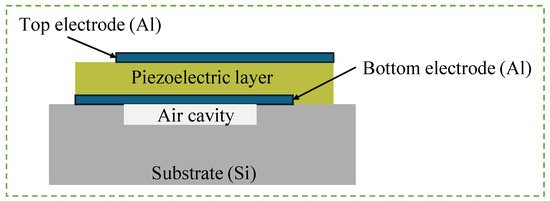 A Thin-Film Bulk Acoustic Resonator (FBAR) is a device composed of a piezoelectric material sandwiched between two conductive electrodes, typically metallic, and acoustically isolated from the surrounding medium, illustrated in Figure 9 [23]. The basic structure includes a bottom electrode, a piezoelectric layer, and a top electrode, all deposited on a silicon substrate [23]. When an alternating current (AC) signal is applied to the piezoelectric material, it converts the electrical signal into a mechanical or acoustic wave that propagates longitudinally within the FBAR device. This wave is then reflected back from the bottom electrode, creating a resonance condition. The resonance frequency is highly sensitive to changes in mass loading on the resonator, making FBARs useful for micro-mass sensing applications [23]. FBARs offer several advantages, including high sensitivity to mass changes, compact size for easy integration into electronic devices, low power consumption, and operation at high frequencies, which is beneficial for precise measurements [23,24]. However, they also have disadvantages, such as complex and costly fabrication processes, sensitivity to temperature changes that can affect performance and accuracy, and limited choices of piezoelectric materials, which can restrict their design and application.