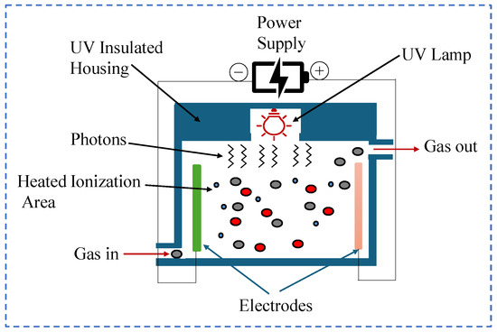 Photoionization detectors (PIDs) are sophisticated devices designed to detect VOCs and other gases. They operate by utilizing UV light to ionize gas molecules within an ionization chamber. The structure of a PID includes a UV lamp, an ionization chamber, and electrodes, as illustrated in Figure 10 [26]. The UV lamp emits UV light, which ionizes the gas molecules in the chamber. These ionized molecules generate an electrical current between the electrodes, and the magnitude of this current is directly proportional to the concentration of VOCs in the gas sample. PIDs are highly sensitive to VOCs and provide rapid responses, making them valuable in various applications. However, they come with some drawbacks, such as the high lamp replacement cost and sensitivity to environmental factors like humidity and temperature [27].