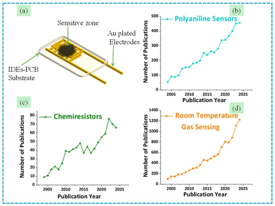 Schematic diagram of a chemiresistor (a). Publication trends in polyaniline sensors (b); chemiresistors (c); and room-temperature gas sensors (d) from 2004 to 2024 (based on a Scopus 15 January 2025.