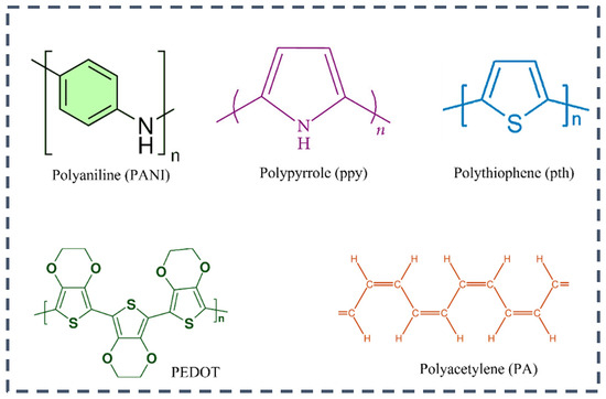 In 1977, the ground-breaking discovery by the American scientists Alan MacDiarmid and Alan Heeger, and a Japanese researcher, Hideki Shirakawa, revealing that polyacetylene (PA) could exhibit metallic conductivity when chemically doped sparked a revolution in materials science [46]. This transformative breakthrough not only led to the development of conductive polymers (CPs), which was accompanied by a Nobel Prize in chemistry in 2000, but it also opened up a world of possibilities for the application of conducting polymers in various technologies [47]. The potential of scientific breakthroughs to inspire and transform our understanding of the world is truly remarkable. Over time, researchers have harnessed the unique properties of conducting polymers such as their ability to conduct electricity and to undergo reversible chemical reactions. In recent years, gas-sensing applications have sparked significant interest in both intrinsically conducting polymers (ICPs) and non-intrinsically conducting polymers (NCPs). ICPs, with their intrinsic electrical conductivity arising from conjugated π-electron systems along the polymer backbone, are particularly promising in gas sensing due to their unique electrical properties [48]. Commonly used ICPs in gas-sensing applications include PANI [49], polypyrrole (PPy) [50], polythiophene (PTh) [51], poly (3,4-ethylene dioxythiophene) (PEDOT), and polyacetylene (PA) [52] (see Figure 13).