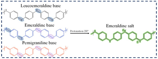 PANI is one of the oldest and most researched intrinsically conducting polymers (ICPs). It is similar to polypyrrole (PPy) but has more advantages such as low-cost monomer, better environmental stability, easier synthesis, and higher electrical conductivity. PANI can take on various forms depending on its degree of oxidation [65]. These forms are distinguished by distinct colors that correspond to their oxidation states. For example, PANI is transparent when fully reduced (leucoemeraldine base, -NH-), violet when fully oxidized (pernigraniline base, -N=), and blue when half-oxidized (emeraldine base, -NH- and -N=) (Figure 14). The color variation of PANI can be advantageous in gas sensing due to its reversible oxidation state. Unlike the other forms, the emeraldine base form is particularly valuable, as it can acquire conductivity when doped with acids to form the emeraldine salt form. The conductivity of PANI is contingent upon the equilibrium between the oxidized-quinonoid and reduced-benzenoid units in the polymer. This reversible oxidation state makes PANI useful in gas-sensing applications, as it can effectively interact with gas molecules and undergo changes in its electrical conductivity, providing a basis for gas detection and sensing [76].