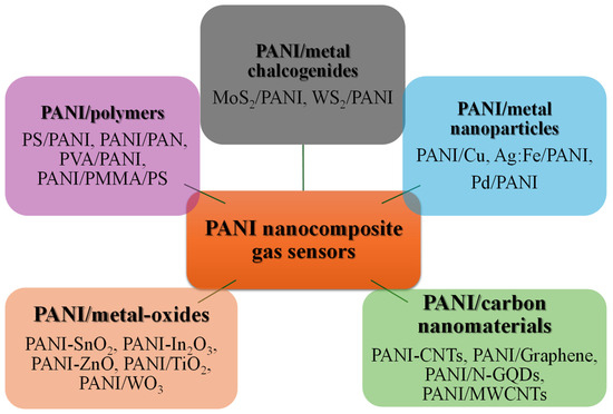 A nanocomposite is a material comprising two or more components with distinct properties, at least one of which has nanoscale dimensions. Nanocomposites can demonstrate novel or enhanced properties different from those of the individual components, as depicted in Figure 15. The objective is to create a material that combines the strengths of each element and provides new opportunities for various applications. However, PANI faces challenges in gas sensing due to limitations such as mechanical instability, resulting in slow gas response times, extended recovery times, and a lack of specificity. To address these shortcomings, PANI can be combined with other materials to form polymeric nanocomposites, thereby improving its sensing capabilities and efficiency [77]. Materials such as carbon nanostructures, metal nanoparticles, metal oxides, metal chalcogenides, and other polymers can be incorporated into PANI to produce nanocomposites with diverse and enhanced features for gas-sensing applications, which will be discussed in the following sections.