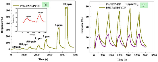 Dynamic response of PSS-PANI/PVDF to 100 ppb–1000 ppm NH3 at room temperature under 25% RH (a); repeatability tests for PANI/PVDF and PSS-PANI/PVDF to 1 ppm NH3 (b). Reprinted with permission from [79], copyright 2024 Elsevier.