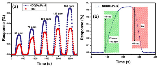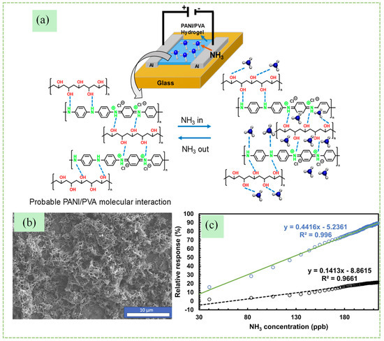 Devi and colleagues synthesized PANI/PVA conductive hydrogels using repetitive freezing–thawing and in situ polymerization methods to detect NH3 at room temperature [80]. The number of freezing–thawing cycles determined the microstructure of the resulting hydrogels, influencing pore size and network interlacing. Using a freeze–thaw process, six hydrogel samples (PPH1 to PPH6) were prepared, each undergoing a different number of cycles. The morphological characteristics revealed a significant impact of the repetitive cycles on the pore size and interlacing network structure. As the number of cycles increased, there was a significant expansion in the pore size, and the interlacing network developed a scale-like leaf structure [80]. Among the different hydrogel samples, PPH4 showed the highest sensitivity to NH3, attributed to its larger specific surface area, which enhanced gas absorption and diffusion. The sensing mechanism was based on the interaction between NH3 molecules and the doped PANI, leading to a protonation–deprotonation process (Figure 17a) [81]. When PANI comes into contact with NH3, NH3 molecules take on protons (H+) from the PANI backbone, resulting in the formation of NH4+ ions. The process was energetically favorable and caused electrons to transfer to PANI, leading to its deprotonation [80]. As a result, the emeraldine salt form of PANI (which is conductive) was transformed into the emeraldine base form (which is non-conductive). When the concentration of NH3 decreased, NH4+ ions broke down into NH3, causing the non-conductive PANI to return to its conductive PANIH+ form [69]. This reversible process of doping and dedoping, or protonation and deprotonation, supports the operation of most PANI-based sensors. The electron dynamics involved in this mechanism allow PANI sensors to exhibit a sensitive response to NH3. Equation (2) is a summary of the anticipated interaction between PANI and NH3 [80].