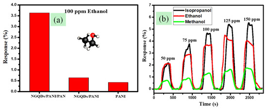 - Masemola, C.M.; Shumbula, N.P.; Gqoba, S.S.; Tetana, Z.N.; Moloto, N.; Linganiso, E.C. Electrospun NGQDs/PANI/PAN composite fibers for room temperature alcohol sensing. In Proceedings of the 2021 IEEE 3rd Eurasia Conference on IOT, Communication and Engineering (ECICE), Yunlin, Taiwan, 29–31 October 2021; pp. 146–150. [Google Scholar] [CrossRef]