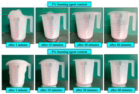 Foamed concrete incorporating protein-based foaming agents offers enhanced ecological and sustainability benefits, making it particularly advantageous in the context of sustainable construction. The addition of foaming agents also significantly influences the rheological properties of the mixture, which is critical for applications such as 3D printing. Excessive amounts of foaming agents can compromise the stability of printed structures; therefore, optimizing both the type and dosage of foaming agents is essential to achieve high-quality 3D printed foamed concrete. In the study of foamed concrete production, foam stability is commonly evaluated by monitoring its disintegration over time. This is typically performed using a transparent measuring cylinder; in the present research, 1000 mL polypropylene (PP) in a beaker with a handle was used for this purpose. Measurement of the volume of water separated from the foam is crucial for assessing foam stability and, if necessary, adjusting the foam-to-cement paste ratio. Figure 2 and Figure 3 illustrate the temporal breakdown of the foam. The air pressure influenced the quality of the foam. Their increase from 4.0 to 6.0 bar accelerated the foam disintegration. Moreover, increasing the foaming agent concentration from 2% to 5% significantly enhanced foam stability (Figure 2 and Figure 3). These results indicate the importance of optimizing parameters during foam production and selecting the appropriate water-to-foaming-agent ratio. The primary parameters influencing foam quality include the type and concentration of the foaming agent in the solution, air pressure, nozzle size, and ambient temperature. Detailed investigations of these parameters are necessary to ensure the production of high-quality foamed concrete with consistent and reliable properties.