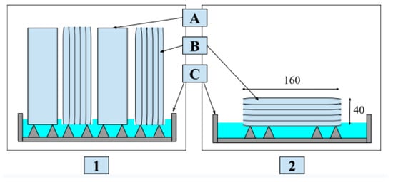 Scheme of capillary water absorption test illustration. A—foam concrete tube; B—foamed 3D printed sample; C—capillary tray; 1—vertical orientation; 2—horizontal orientation.