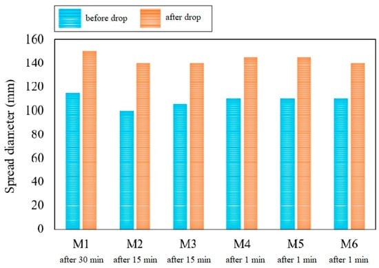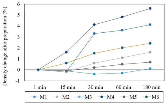 The evaluation and understanding of the consistency of a foamed mixture prior to initiating 3D printing are critical, as the consistency directly influences the precision and quality of the printed structure. An optimal consistency ensures that the material retains its properties and stability during the layer-by-layer application process. A mixture with excessive fluidity can lead to spillage and loss of print shape, whereas an overly viscous one may result in flow challenges and application difficulties. Moreover, consistency also plays a crucial role in the adhesion and bonding of the mixture, which are fundamental for the structural integrity of the final object. Proper consistency ensures effective bonding between individual layers, thereby contributing to the durability and stability of the printed structure. Furthermore, understanding the consistency of the mixture facilitates adjustments to printing parameters, such as extrusion speed and temperature, which optimize the process and reduce the risk of defects. The bubble quantity and structure within the foam significantly impact the stability of the lower layers during printing. Over time, foam instability may arise due to bubble coalescence driven by pressure differences []. To investigate these phenomena, the stability of the fresh composite foam was analyzed both before and after extrusion, as well as over time. Wet density measurements were used to assess the stability of the mixtures. These measurements provide direct insights into foam stability in aerated concrete; an increase in density indicates foam collapse within the composite material []. This evaluation highlights the dependence between consistency, foam stability, and printing parameters, which collectively determine the success and quality of 3D printed foam-based materials. Figure 5 presents the temporal changes in the density of the studied mixtures, providing insights into the stability of foamed concrete. For samples incorporating synthetic foaming agents, M1 exhibited a relatively stable increase in density, from 3.3% after 30 min to 4.1% after 180 min. This indicates moderate foam stability, with more pronounced changes occurring after the initial 30 min attributed to foam degradation processes such as liquid expulsion, gas diffusion, and liquid film rupture, as described in the literature []. Phenomena such as liquid expulsion from the foam, gas diffusion, and liquid film rupture significantly impact the stability of foamed concrete. Liquid expulsion due to gravity and surface tension reduces the film thickness, leading to rupture []. Moreover, gas diffusion contributes to bubble coalescence, further destabilizing the foam structure. The behavior of M3 revealed exceptional foam stability, as evidenced by a negligible density decrease of 0.1% after 180 min. Similarly, M5 demonstrated good foam durability, with a minimal density increase of 0.7% over the same period, indicating minimal structural changes over time. For mixtures with protein-based foaming agents, M2 shows a stable yet modest density increase, ranging from 0.6% after 30 min to 1.6% after 180 min, reflecting relatively stable foam properties. In contrast, M4 displayed the most significant density increase, rising from 4.1% after 30 min to 5.6% after 180 min, indicative of considerable foam degradation and instability over time. M6 showed a moderate density increase, from 1.3% after 30 min to 2.44% after 180 min, suggesting moderate foam stability with a tendency for gradual deterioration. The results indicate that most samples, except for M4 and M6, experienced a slight decrease in density within the initial 15 min, which stabilized thereafter. The initial decrease in density observed in foamed mixtures can be attributed to foam settling and the rearrangement of air bubbles within the matrix. During this phase, air redistributes within the foam structure, resulting in a more uniform configuration and a temporary reduction in density. Furthermore, the burst of larger air bubbles contributes to a decrease in air content, which leads to increases in the density of the mixture. Following this preliminary stage, as the foam structure stabilizes, density begins to rise again. This increase may be linked to the progressive binding of the material and tightening of the foam matrix during which the air content becomes fixed and stable. The consistency of the mixture significantly affects not only the mechanical properties of the final product, such as strength and durability, but also its esthetic attributes by mitigating issues like surface unevenness or cracking. Another critical parameter is the open time of the foamed mixture, defined as the duration during which the material remains workable before curing initiates. Knowledge of the open time enables effective planning of the printing process, ensuring the material is applied during its optimal workability period. An inadequately short open time may cause application challenges, such as clogging of the material in the nozzle and failure to achieve the desired properties in the printed structure. To evaluate the time at which the mixture achieves a consistency suitable for 3D printing, a slump test was performed using the slump table method [,,]. The obtained results are presented in Table 6.