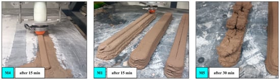 To evaluate the extrudability of cellular concrete mixture, five individual layers, each 490 mm in length, were printed for each composition under consistent feed rates and printing speeds. Extrudability was considered satisfactory if the layers were printed successfully without variations in thickness, cracks, delamination, or blockages. Buildability was assessed by examining the deformation of the lower layers under the weight of subsequent layers. Uniformity in layer thickness along the layers’ length was deemed essential. Additionally, the mixture was required to demonstrate sufficient flexibility and stability to prevent cracking during extrusion while minimizing the risk of delamination, which could compromise the structural integrity of the printed element [,,,]. To ensure efficient and smooth printing operations, the material must exhibit unobstructed flow through the nozzle, facilitating continuous extrusion []. During the deposition of successive layers, the mixture should retain its shape after printing, while the underlying layers must resist excessive deformation under the weight of additional layers []. Structural stability is vital to enable subsequent layers to support the imposed loads and maintain their geometry throughout the construction process. Moreover, achieving uniform bonding between layers is essential to ensuring the overall structural integrity and mechanical strength of the final product. Adherence to these criteria is critical for fabricating a durable, well-constructed structure with satisfactory mechanical performance. The printing process for the evaluated mixtures is illustrated in Figure 9.