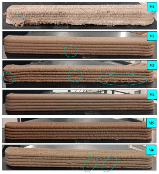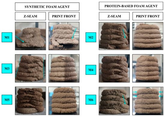 Figure 11 presents a comparative analysis of the extrudability and buildability of foamed concrete samples produced with synthetic (M1, M3, M5) and protein-based (M4, M2, M6) foaming agents, alongside the effects of foam stabilizers. The images highlight differences in layer deposition quality (Z-seam), structural stability, and surface smoothness between the two types of foaming agents. Arrows indicate regions where a noticeable sagging of layers occurred due to the weight of the overlying material. The sample M1, printed 30 min after mixture preparation, exhibited significant flow and deformation in the lower layers, compromising structural stability. In contrast, the freshly prepared sample M3 demonstrated an uneven surface at the Z-seam; however, the front view revealed uniformly deposited and stable layers. For sample M6, it was observed that the three lower layers are visibly wider than the upper layers. This effect is likely attributed to the rapid action of the stabilizer, which affected the consistency of the mixture during extrusion, leading to changes in layer geometry over the printing process.
