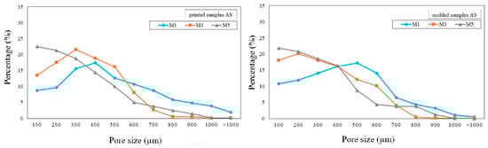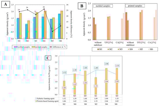 The analysis of the production method’s impact on apparent density, as presented in Figure 12A, reveals that cast samples exhibit lower density compared to those produced via 3D printing. The density differences range from 0.2 to 0.5 g/cm3, indicating that 3D printed samples are denser and more stable. This observation is consistent with the inherent characteristics of the 3D printing process, which involves layer-by-layer extrusion, leading to the natural densification of the material []. This method ensures effective space filling while reducing the number of pores, thereby contributing to increased density. The smallest percentage differences in density between printed and cast samples were observed in mixtures M5 and M6 containing the CA stabilizer, with difference values of 6% and 11%, respectively. This phenomenon can be attributed to the rapid initiation of binding and emulsification processes in these mixtures, enabling them to retain their foaming parameters across both casting and printing techniques. This outcome is particularly advantageous in 3D printing, as successive layering does not significantly compromise the pore structure, thereby preserving the material’s insulating properties. Stabilization, in terms of maintaining the density of foamed materials, enhances the control over the 3D printing process and contributes to material efficiency. Furthermore, the apparent density results were classified to examine the influence of stabilizers on material properties for different production methods. Figure 10 illustrates that the application of stabilizers significantly improves material stability. Samples without stabilizers exhibited the lowest density and were less stable, as shown in Figure 10 and Figure 11, making them unsuitable for applications requiring long-term durability [,,]. The incorporation of the used oil stabilizer (UO) results in a slight increase in density, enhancing stability. However, the most significant improvement in sample density was observed with the addition of the CA stabilizer (EXOalc 1618), which led to a substantial increase in material density, indicating an enhancement in material structure. This, however, also results in a higher mass of samples. A potential compromise could involve the use of a moderate amount of CA stabilizer, maintaining adequate stability while achieving an acceptably low density. This presents an excellent opportunity for further research to optimize the proportion of ingredients, thereby improving the material’s properties. Future studies could also focus on understanding the mechanisms influencing the binding and stability of foamed concrete under various technological conditions, particularly at larger scales. Figure 12C highlights the influence of foaming agent type on concrete density. Samples produced with synthetic foaming agents (AS) exhibit lower apparent density, ranging from 1.46 to 1.90 g/cm3, which is advantageous in terms of material weight reduction. In contrast, concrete produced with protein-based foaming agents (PS) shows a broader density range, from 1.06 to 2.05 g/cm3. While the increased density of PS samples may contribute positively to structural stability, the synthetic agent (AS) appears more suitable for optimizing lightweight foamed concrete. The addition of the CA stabilizer further contributed to reducing the density in both cast and 3D printed samples.
