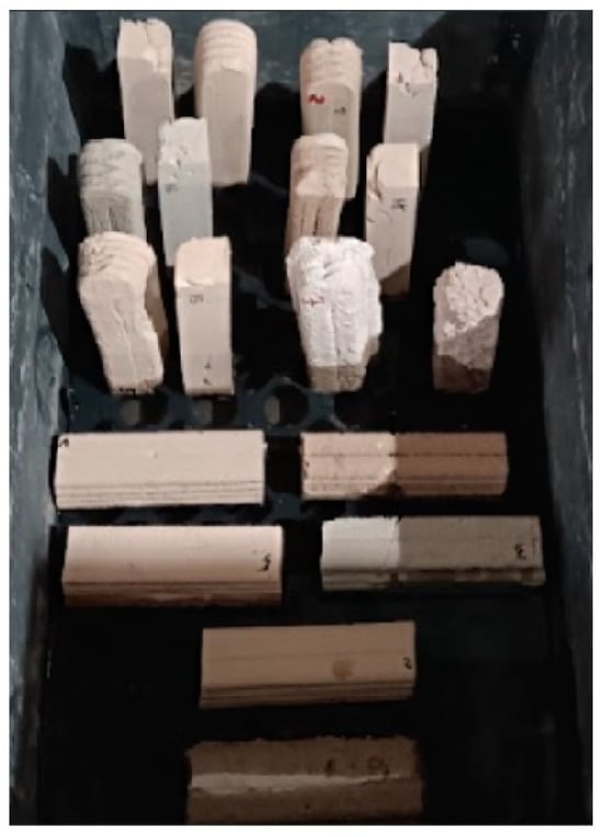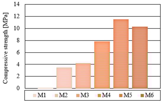 Compressive strength tests adhered to the EN 12390-3 standard [], utilizing samples with dimensions of 40 × 40 × 40 mm and tested at a speed of 1 mm/min. These standardized methodologies ensured accurate and reliable results, providing a robust assessment of the material’s mechanical performance for practical applications.