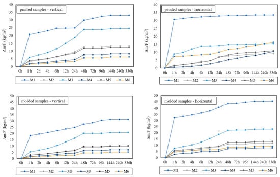 Figure 13 presents a view of the samples during the water absorption tests, concerning the influence of sample orientation and the type of mixture used. In contrast, Figure 14 depicts the relationship between water absorption and time for sample M1. The water absorption coefficient A was calculated for each sample.