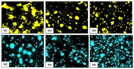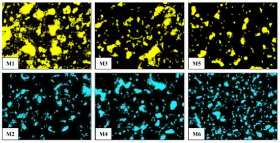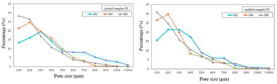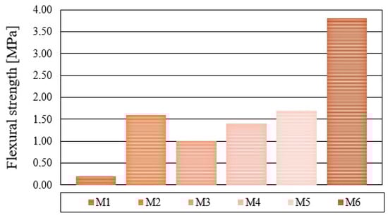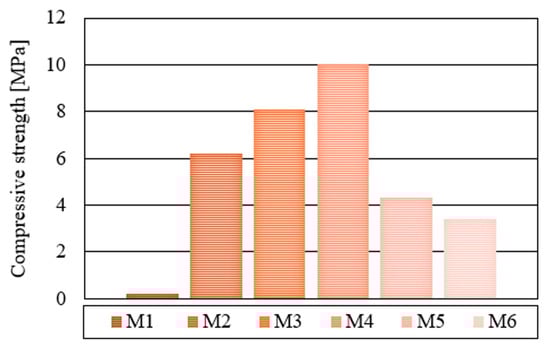 The PS-foamed samples, namely M2, M4, and M6, are characterized by significantly more regular porosity. These samples exhibit the highest strength values. M4 and M6 demonstrate bending strengths of 1.4 MPa and 3.8 MPa, respectively, along with the highest compressive strengths in the perpendicular direction (7.8 MPa and 10.3 MPa) and parallel direction (10 MPa and 4.3 MPa). These findings suggest that the uniform distribution of pores, despite their high quantity, enables effective load transfer and minimizes stress concentration. Sample M2, however, yields more moderate results, with 1.6 MPa in bending, 6.2 MPa in parallel compression, and 3.5 MPa in perpendicular compression. These values suggest a relatively limited influence of pores on the material’s strength compared to the other samples. The results clearly differentiate between CA-stabilized samples regardless of the foaming agent used. Samples subjected to compression perpendicular to the layer deposition direction exhibit the highest strength values (M5: 11.5 MPa and M6: 10.3 MPa), while those tested parallel to the deposition direction display strength values nearly three times lower. This discrepancy may be attributed to the 3D printing process, in which the layers of rapidly emulsified material may not bond sufficiently, leading to a reduction in mechanical strength along the direction parallel to the print. The weaker connections between individual layers likely result in diminished load transfer in this direction, as evidenced by Figure 11, where the upper layers of the prints appear narrower due to the denser material flow from the extruder.