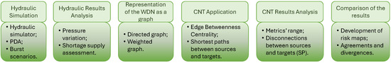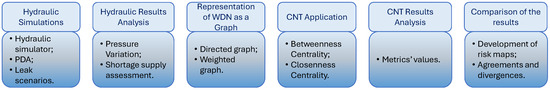 This research formalizes an integrated approach that combines hydraulic simulations with CNT to identify the most vulnerable elements in WDNs. Critical elements are defined as those whose failure could cause significant disruptions in service, such as major pressure drops or supply interruptions. CNT leverages a high computational efficiency to develop a novel approach that uses a single hydraulic simulation to weight the network graph. In contrast, traditional approaches purely based on hydraulic simulations require a separate simulation for each failure scenario, substantially increasing the computational time. While CNT speeds up the process, it is complemented by hydraulic simulations, ensuring the robustness and accuracy of the risk assessment. To enhance clarity and illustrate the methodological steps, flowcharts have been added to depict the sequence of steps for criticality analysis, mainly for pipe break and leak scenarios.