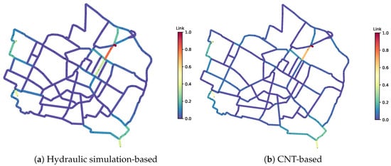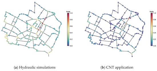 The case studies presented in this paper demonstrate the application of hydraulic simulations and CNT to assess criticality in WDNs. The Modena network provides contrasting scenarios in terms of network complexity and scale, allowing for a robust evaluation of the methodologies. In the case study, hydraulic simulations identified critical pipes based on flow rates and the extent of service disruption resulting from pipe breaks or leaks. The simulations showed that pipes near reservoirs or those carrying higher flow rates were more critical, a pattern echoed by the CNT analysis. A comparison of criticality maps revealed a strong alignment between hydraulic simulations and CNT results, particularly in identifying key elements such as trunk pipes. The consistency between these two methods underlines CNT’s potential as a fast, reliable alternative for criticality assessment, particularly in large and complex networks where computational efficiency is paramount.