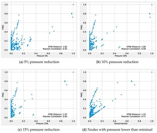 Maps of normalized criticality are generated to compare the results of hydraulic simulations with those of CNT applications. For each modeled failure (such as a pipe break or leak), the pressure reduction calculated from Equation (1)) is summed across all simulated time steps. The total PR for each element in the network (pipes for pipe breaks and nodes for leaks) is then normalized on a scale from 0 to 1, where 1 represents the highest sum. This identifies the most critical element in the event of a failure. The same normalized criticality concept is applied to the shortest path and betweenness centrality. For each simulation of a pipe break, the shortest path among sources and consumption nodes is calculated, and the sum of the shortest path is associated with a pipe. Finally, this sum is normalized between 0 and 1, with 1 as the highest sum corresponding to the more critical link. To assess the similarity between the hydraulic-based and CNT-based approaches, a quantitative analysis is performed with the help of two complementary indicators, the Pearson correlation coefficient and Dynamic Time Warping (DTW), which offer distinct yet synergistic perspectives on the relationship between the two approaches.
