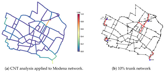 Comparison of criticality map based on CNT analysis and 10% trunk network applied to Modena network.